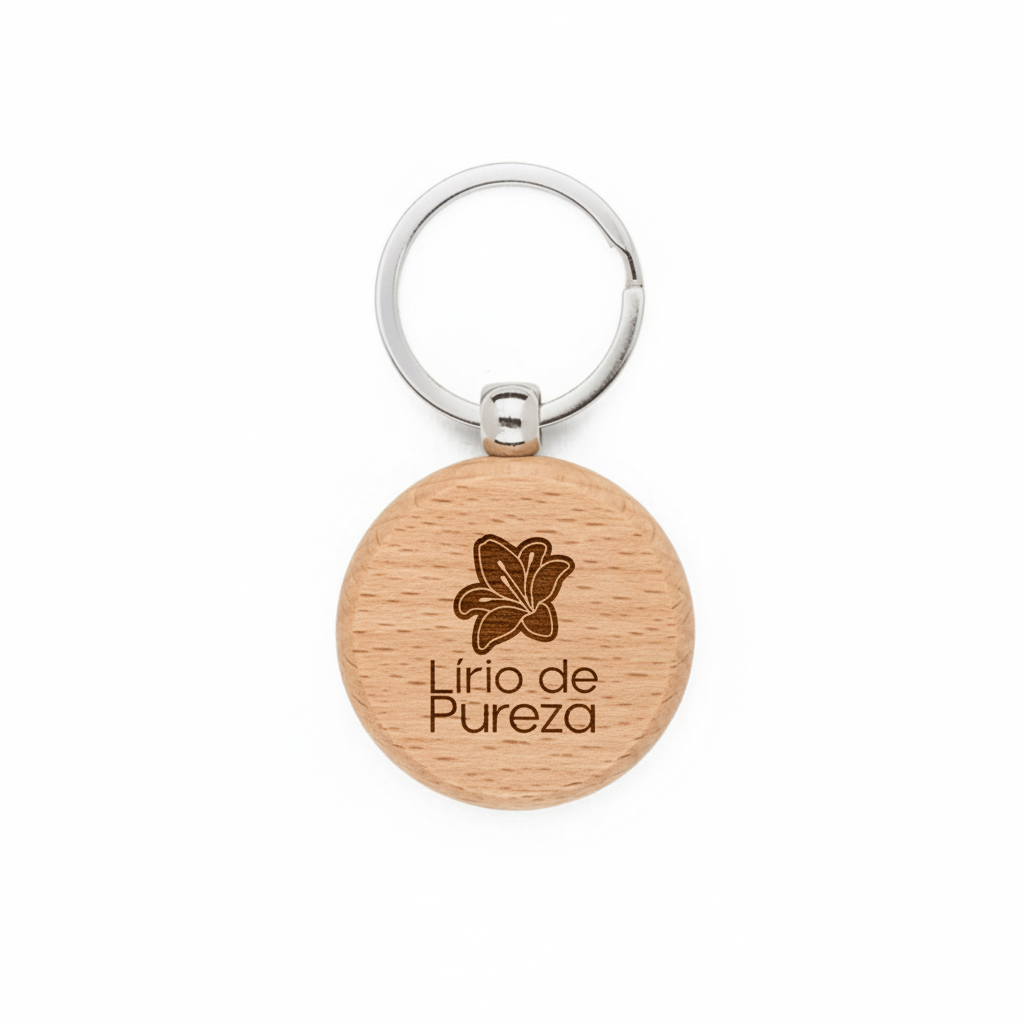 Chaveiro em madeira de faia, resistente e elegante. Possui uma argola em ferro para facilitar o transporte e arrumação. A cor e o resultado da impressão nos materiais naturais pode variar entre produtos. 40 x 77 mm | Chaveiro: ø40 mm | Argola: ø32 mm